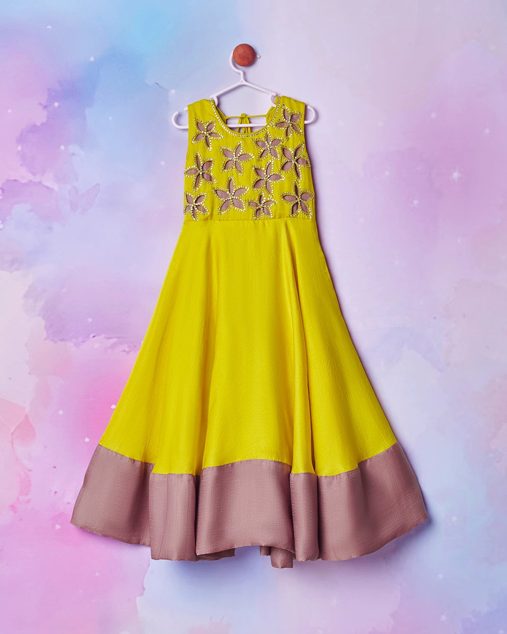 • Gown style set with applique contrast shade flower at the yok